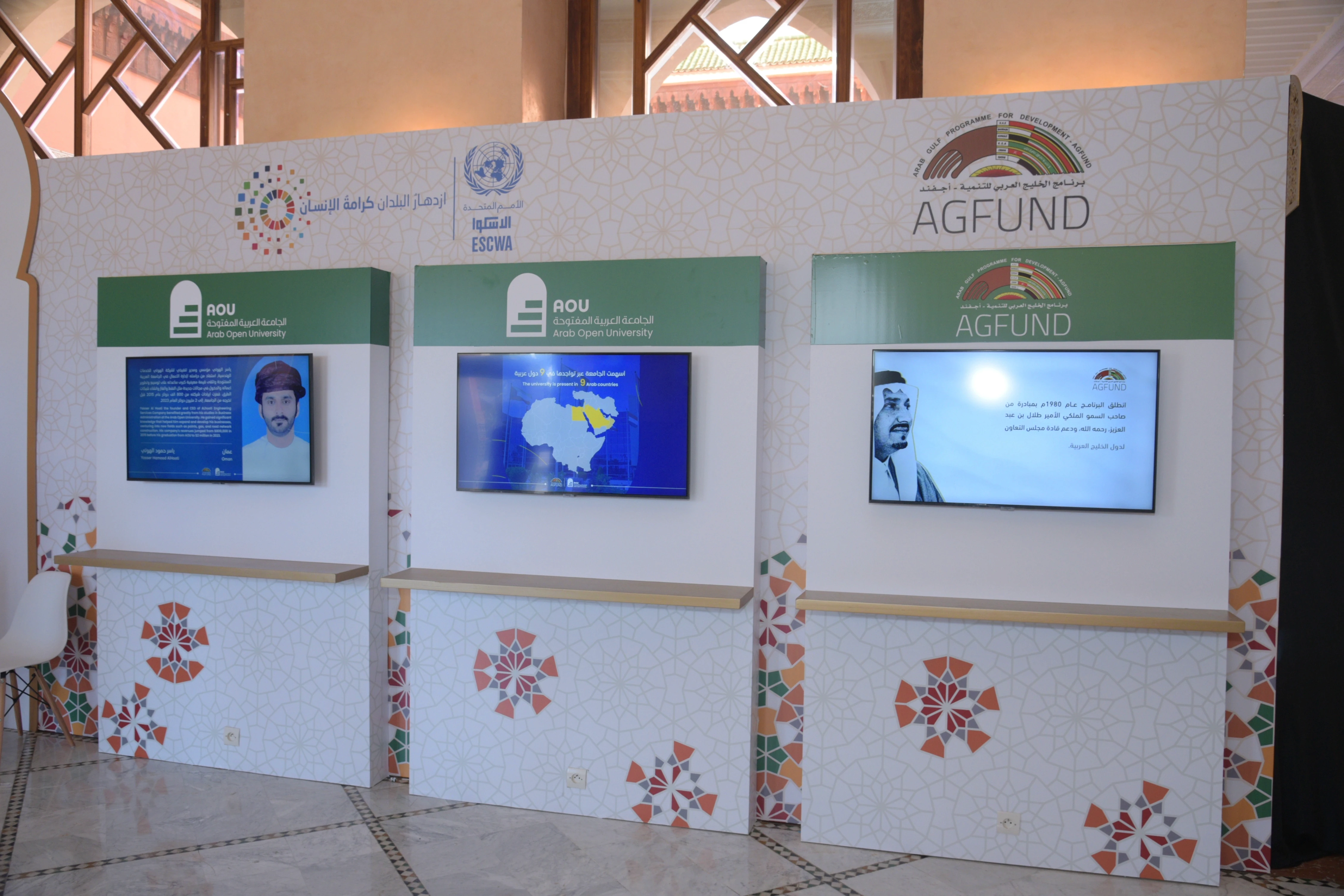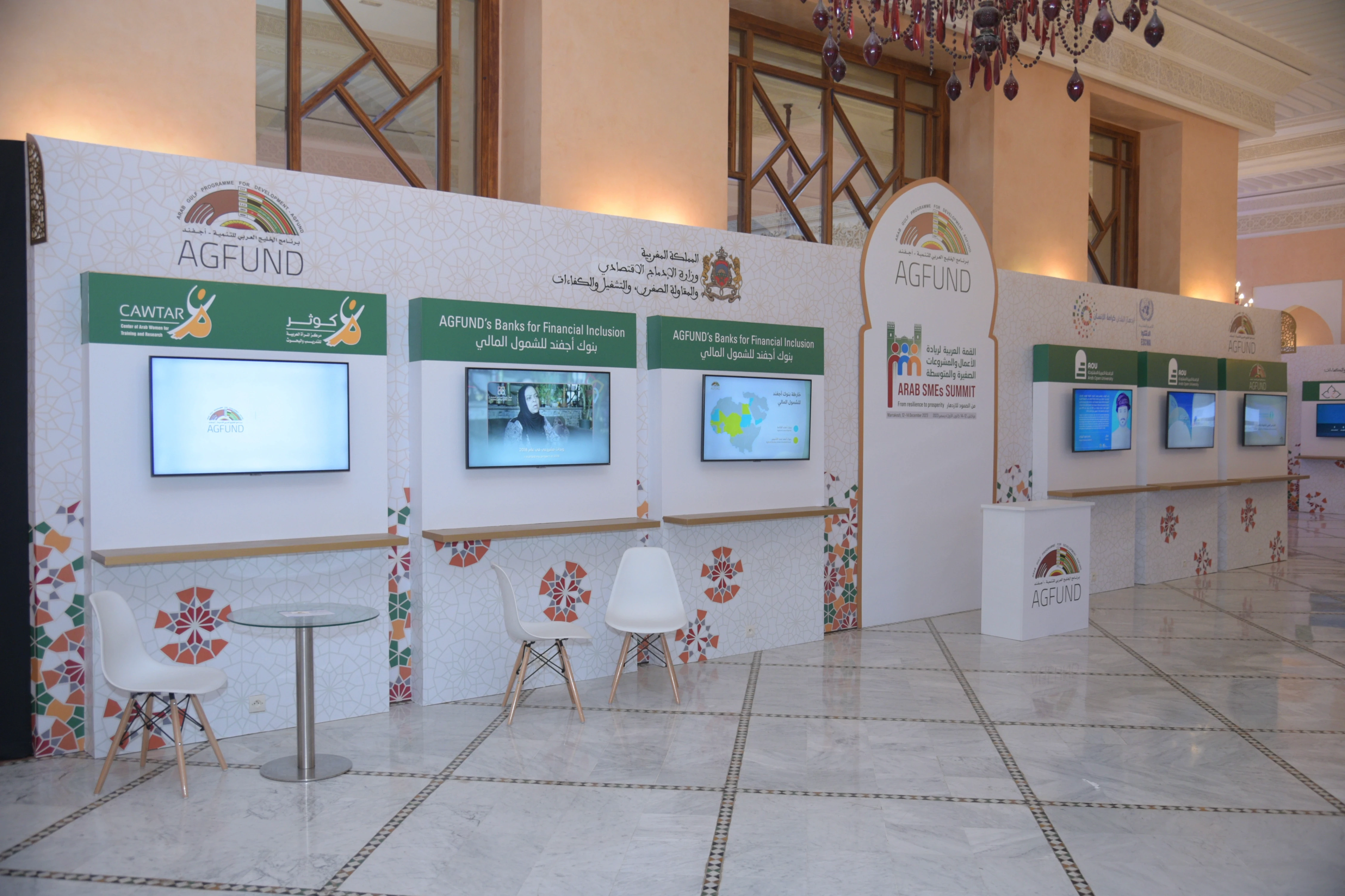 Design content and the booth experience for the Arab Gulf Programme for Development participating in the Arab Entrepreneurship Summit, by transforming the success stories of 14 Arab development institutions into a clear visual presentation and an interactive experience journey, improving comprehension and communicating development messages through a contemporary, focused exhibition language.